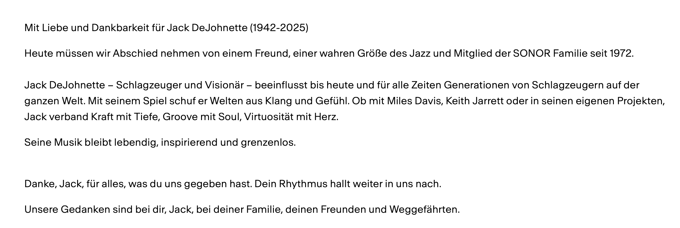 Am 2. Mai 2025 verstarb James „Jimmy“ Sargent im Alter von 90 Jahren in Düsseldorf. Der britische Jazzschlagzeuger, langjährige SONOR-Artist und engagierte Musikpädagoge prägte über Jahrzehnte die Jazzlandschaft in Deutschland und Europa.